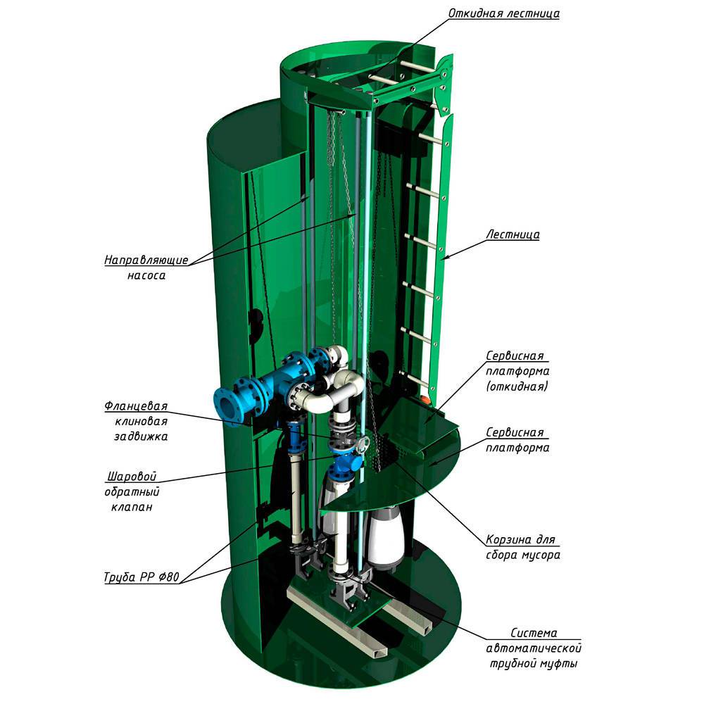 В комплект КНС входит внутренняя лестница и корзина для удержания крупного мусора. Внутренняя обвязка КНС и оборудование считаются индивидуально под требования заказчика.